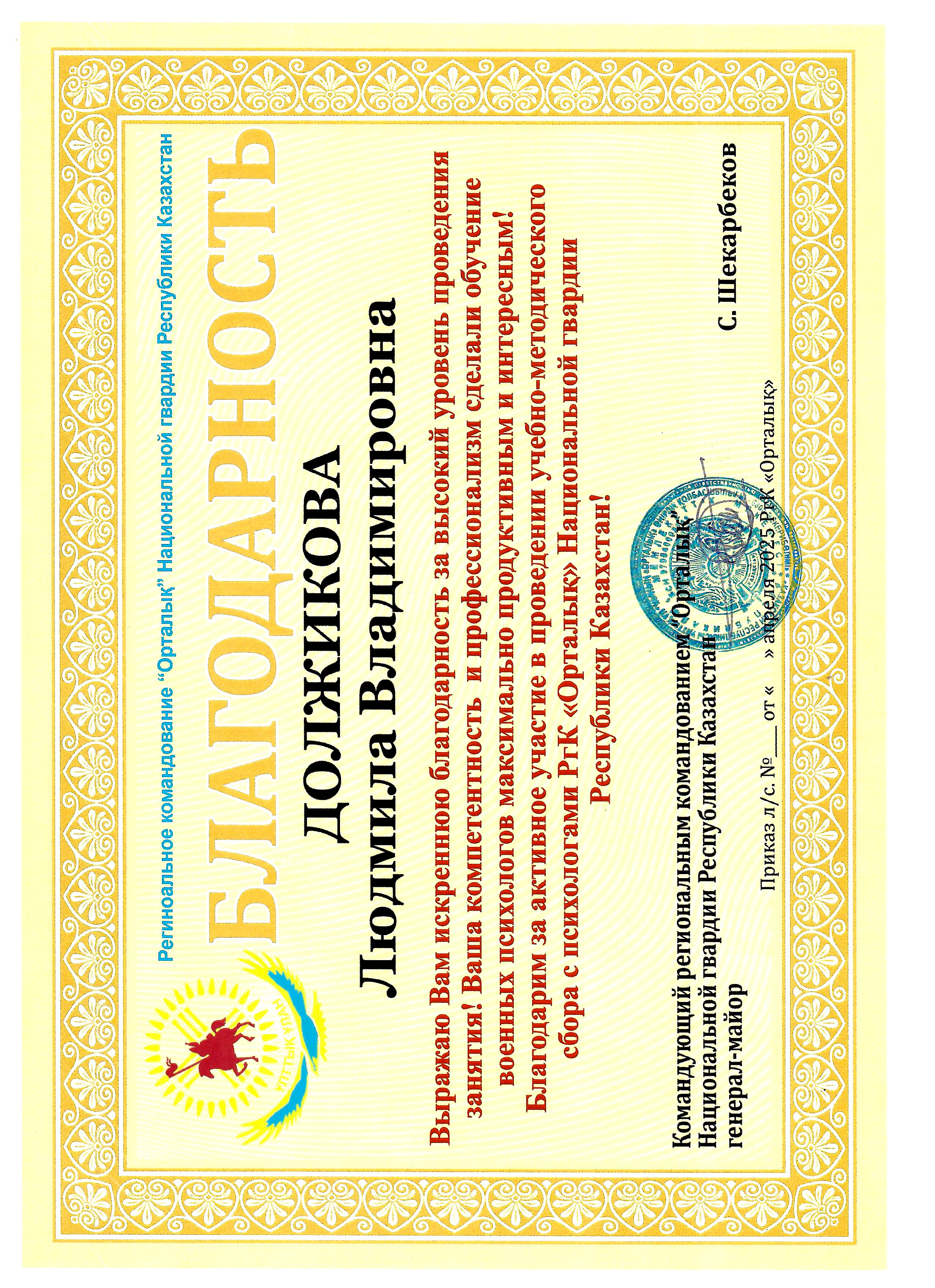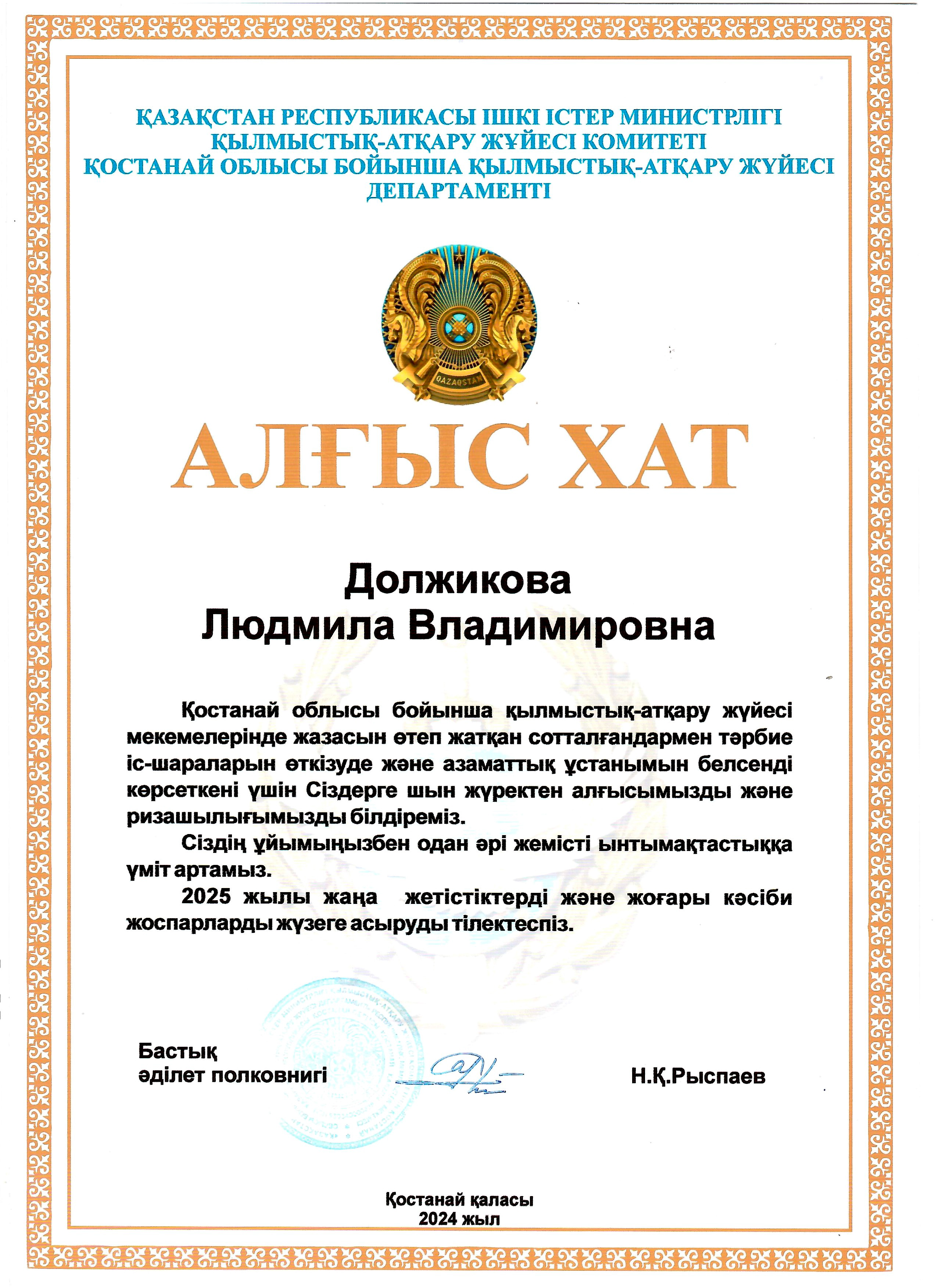 Отмечена благодарственными письмами: Специализированного межрайонного суда по делам несовершеннолетних, Департамента уголовно-исполнительной системы, Департамента экономических расследований, а также Альянсом женских сил по делам женщин и семейно- демографической политики при президенте РК.